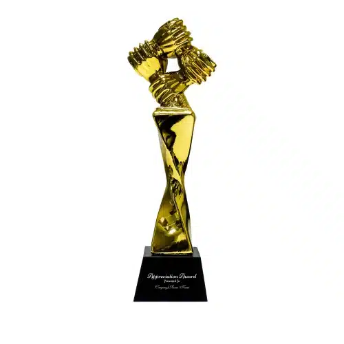 Celebrate achievements in style with this elegant golden trophy. Featuring a radiant gold design and a sturdy black base, this award is ideal for recognizing excellence in any field—be it sports, academics, or corporate milestones. Its modern and eye-catching design ensures it stands out as a symbol of accomplishment and pride. Perfect for award ceremonies, competitions, and events.