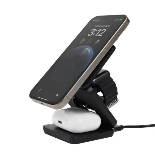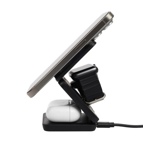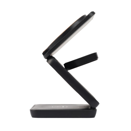 3 in 1 wireless bamboo charger with a foldable compact design. It is compatible with any mobile phones with QI standard. It adopts high-end quick charge. Made with eco-friendly materials, safe and reliable enabled with WPC Qi charging technology & 15W output.