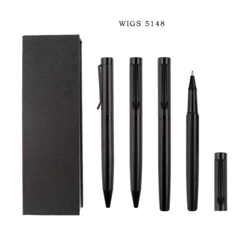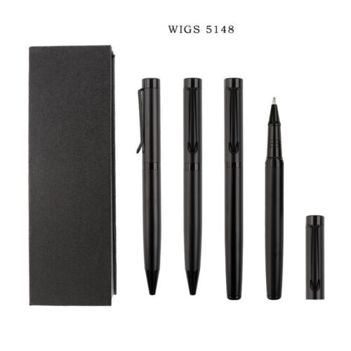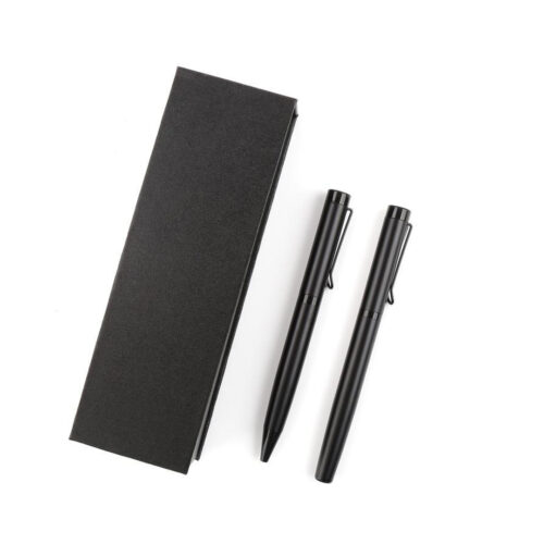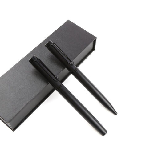 A gift set of roller and ball pen made of copper with stainless steel barrel. Packed in a black gift box.