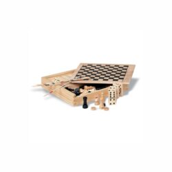 Wooden box including domino, chess, drafts and wooden sticks games.