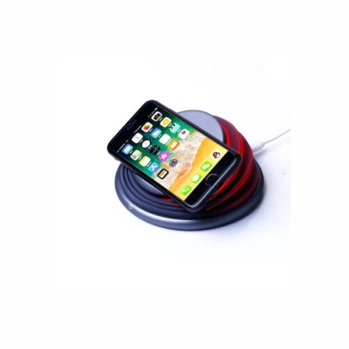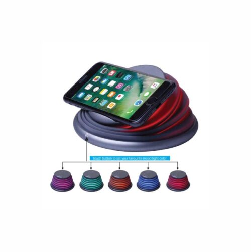 Sorrento is a 10 Watt fast charge desk wireless charger with color changing mood light. The collapsible silicon design allows for the phone to be positioned and charged at various angles depending on the use. The single touch button on the front allows for 6 different colors to be displayed with each touch. This useful device is a perfect eye catcher for your offce or home! Compatible with all QI enabled devices like Android, iOS latest generations, eg. Samsung S6 and above, iPhone 8, and above. Input: 5V/2A. Wireless Output: