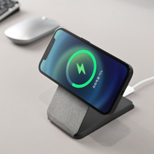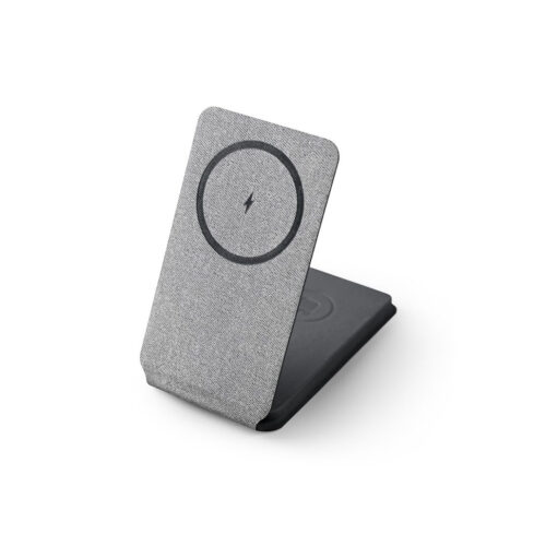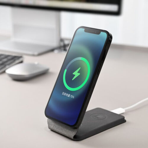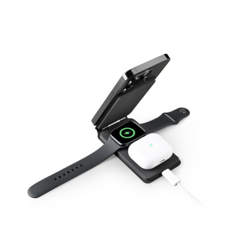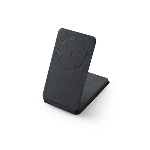 3n1 two folds magsafe wireless charger that can be used as magnetic phone stand in recycled PU Material. Strong magnet that can hold mobile in place. 15W for phone,5W for airpod,2.5W for apple watch. Product Size: 12.4×6.7×1.3cm. Packaging: Black Box