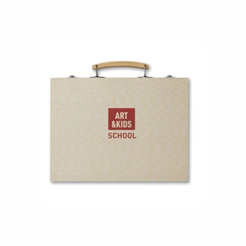 Artist’s set in wooden box including 66 pieces (wax crayons, oil pastels, markers, coloured pencils, water colours, sharpener, glue, eraser, paint brush, ruler, and pencil).