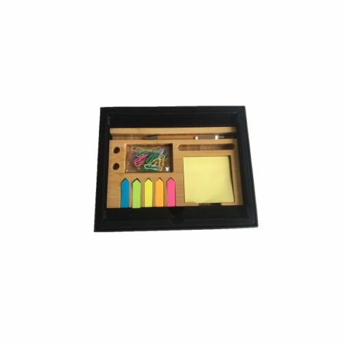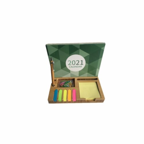 ‘A Bamboo desktop organizer with 350GSM art paper printed calendar and bamboo mouse pad. Has 100 sheets sticky note, 5 colors 150 sheets arrow shape sticky note, 40pcs clips and ballpen. Packed in a black special paper cardboard with PVD lid. Desktop Size: 21*12.9*2.9cm ; Calendar Size: 20.8×16.6cm Mousepad Size: 20.8×16.6cm Packaging Size: 19.9×24.1×4.4cm Packaging: Black Sleeved Box