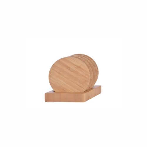 Bamboo coaster consist of 5 round coasters with a holder. Dimension:15X9X5cm