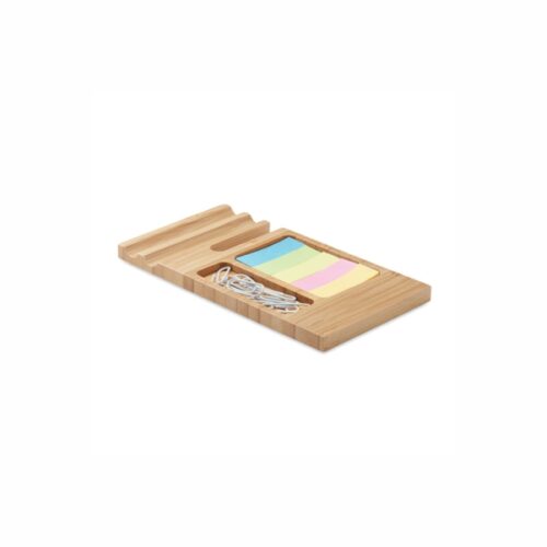 Bamboo desk phone stand with paper clips and sticky notes. An organized office is a productive office. Keep your desk clean and use an organizer to store smaller office supplies in one place. This bamboo stand also has a holder for your smartphone. Bamboo is a natural product, there may be slight variations in colour and size per item, which can affect the final decoration outcome. Size 9×16,5×0,8 cm.