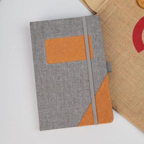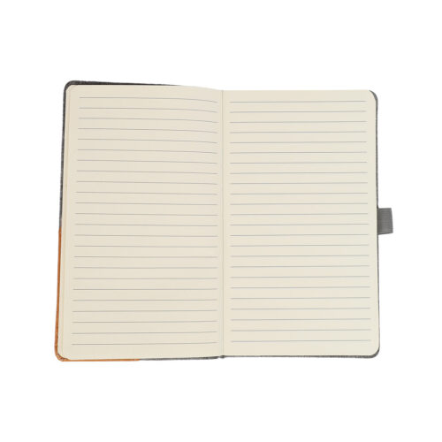 A5 notebook made with recycled PET material with leather detailing. Contains 80 single-lined sheets with 70 GSM quality and comes with first information page and 4 year calendar.