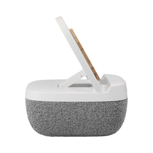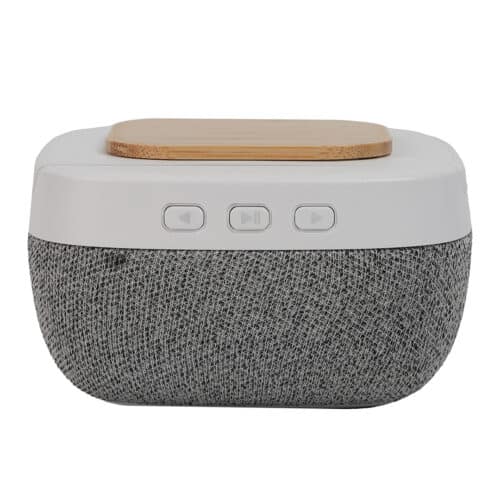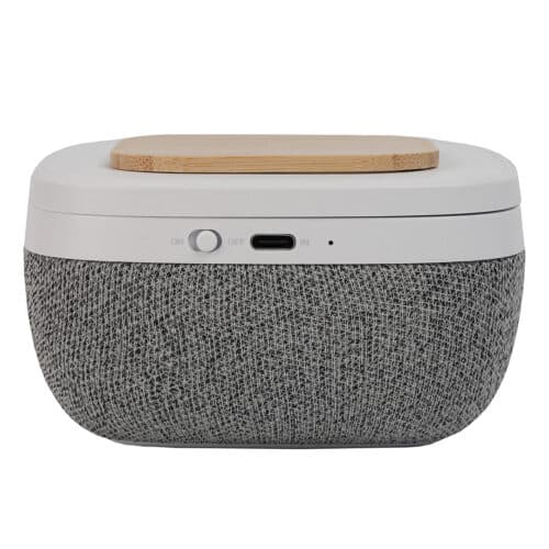 A 5W bluetooth speaker that also had an inbuilt wireless charger of 15W. The housing is made of ABS+Imitation linen+bamboo, it has a battery life of 12000 mAh and a type-C input.