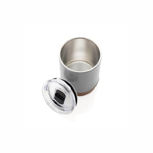 Vacuum insulated cork coffee mug with unique cork detail. Made with Stainless Steel grades SS304 inside and SS201 outside. Keeps your drinks hot for up to 5h and cold up to 15h. Fits most coffee machines. Content: 180ml.