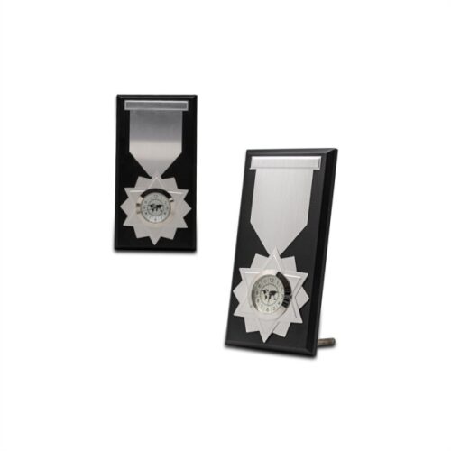 Trophy crafted in wood with metal plating in Gold & Silver shaped as a Honour medal. An elegant clock adds to the functionality of this trophy. It can be placed on the mantelpiece, or even hung on a wall.