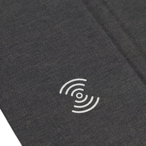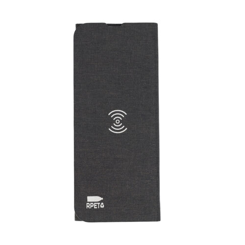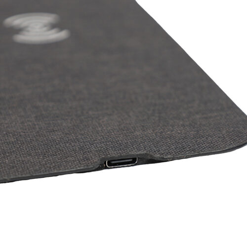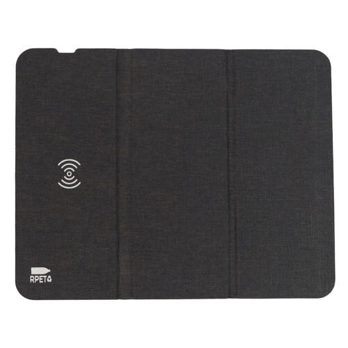 A mousepad made from recycled PET material with 10W wireless charging properties. It is foldable and acts as a phone holder.