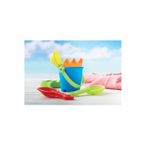 Kids beach toys composed of a bucket, a shovel, a rake and 3 moulds. All made in matt PP. Delivered in random coloured pieces.