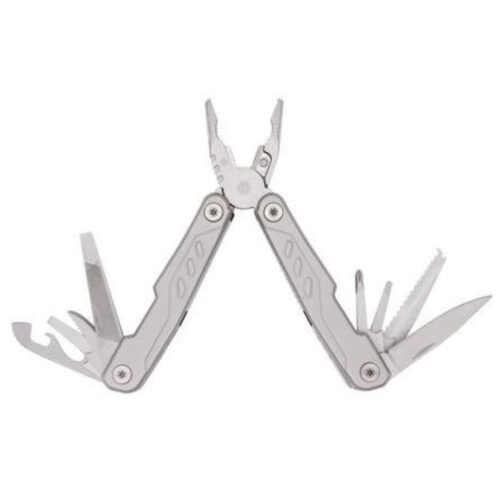 Kitee is a premium stainless steel multi-tool with 15 function tools including: needle nose pliers, regular pliers, wire cutters, large, medium & small screwdrivers, double file, single file, small knife, medium screwdriver, can opener, bottle opener, phillips screwdriver, saw, hook remover, and sharp knife. Packed in a carry pouch.