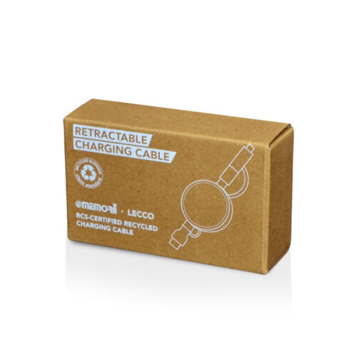 Lecco is a RCS-certified recycled retractable 6-in-1 charging cable which is made of 29% recycled plastic and recycled PU. Cable extends up to 100CM in length. It has a USB-A and Type-C input and 2-in-1 (micro-USB & lightning) and Type C output. Packed in a recycled kraft gift box.