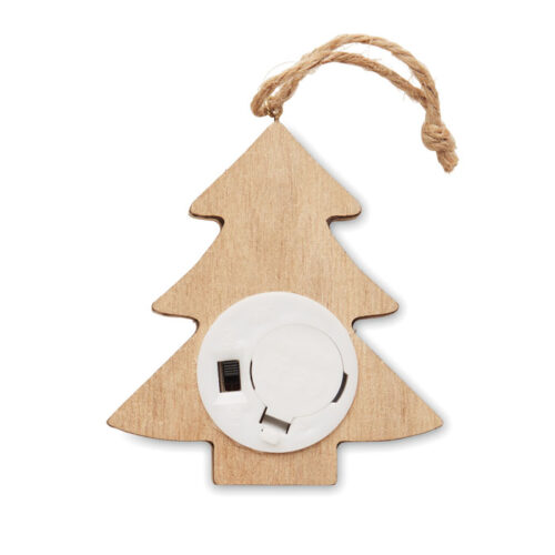 Wood (80% poplar wood and 20% weed wood) decorated tree with 6 LED light and hanging cord. Including 1 CR2032 battery. Wood is a natural product, there may be slight variations in colour and size per item, which can affect the final decoration outcome.