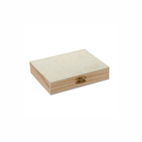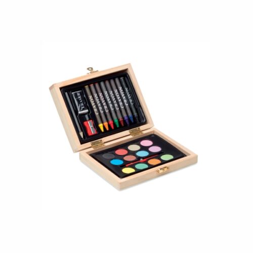 Mini artist’s set in wooden box including 8 crayons, 12 water colours, 1 paint brush, 1 sharpener, 1 eraser and 1 pencil.