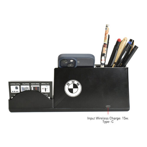 MULTI -PURPOSE CHARGING ORGANIZER Input : 9V-2A, 5V-2A, USB Output: 5V-2A (Max) Wireless Output: 15W Dimension : 255x97x94mm Printing Option : Engravi…