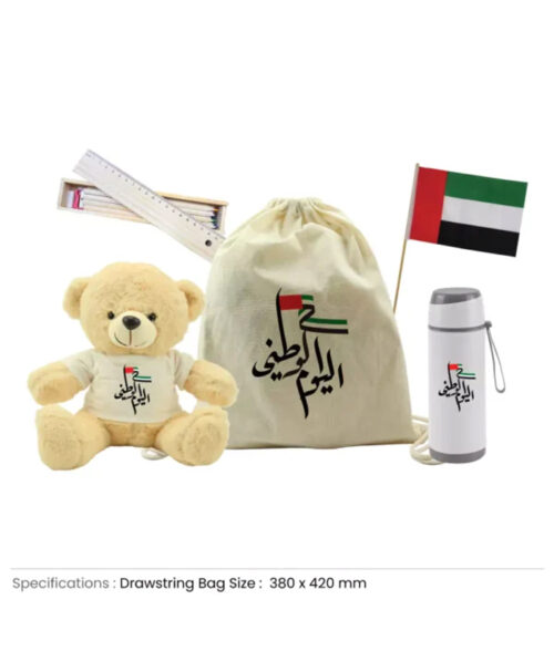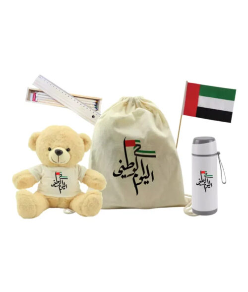 Celebrate National Day with our specially curated National Day Gifts! Each set comes in a convenient drawstring bag, making it a perfect gift for all ages. Celebrate National Day with our delightful gift sets! Each set includes vibrant colored pencils set in a wooden box, A4-sized UAE flags, adorable teddy bears with customizable white t-shirts, and stylish 500ml sports glass bottles. Packaged in a convenient drawstring bag, these sets are perfect for sharing joy and pride in the UAE!