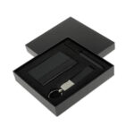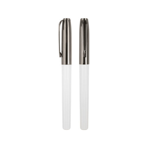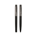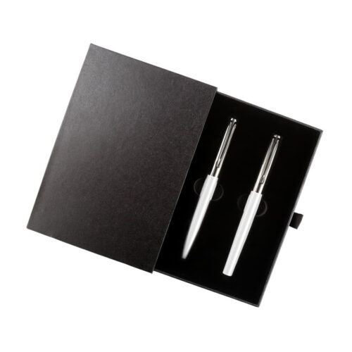 A gift set of roller and ball pen made of copper with stainless steel barrel. Packed in a black gift box.