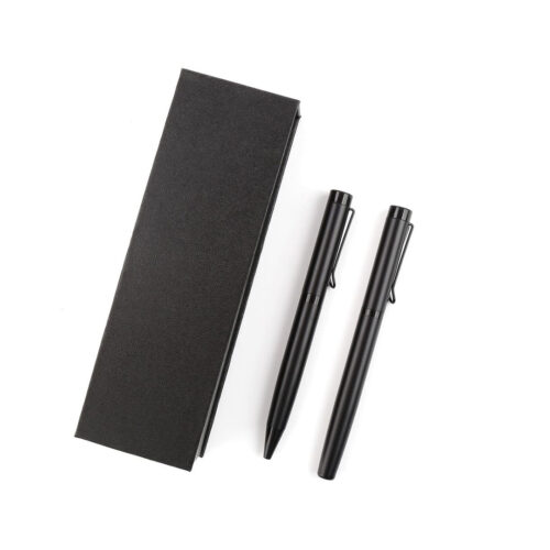 A gift set of roller and ball pen made of copper with stainless steel barrel. Packed in a black gift box.