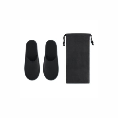 Pair of polyester hotel slippers presented in a non woven pouch. EUR size 44 – 45.