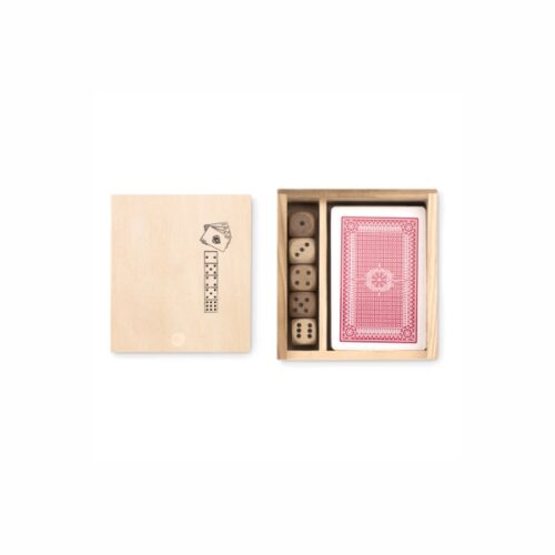 Playing set with 54 cards and 5 dice. Presented in wooden box.