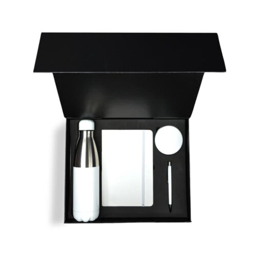 Maximize your productivity time with this gift set! This includes a double walled bottle, a multi-cable set, notebook & pen: