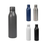 A bottle made with stainless steel with a powder coated body and a bamboo lid. The lid features a food grade silicon lid making it leak-proof.