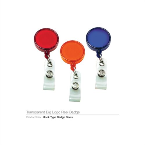 Plastic reel badge with slide-type belt clip and clear strap for ID.