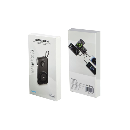 Rotterdam 5 in 1 universal charger is the ultimate portable charger, equipped with a robust 10,000mAh battery, 2 super-fast 15W magnetic wireless chargers to simultaneously charge your latest phone and smartwatch, and 2 in-built Lightning and Type C adaptors for seamlessly charging your iPhone or Android phones. Can simultaneously charge 5 devices at once. With its rapid PD 20W USB-C capability, you can recharge your PD-enabled device up to 50% in under 30 minutes. With battery indicator LED. Packed in a gift box