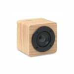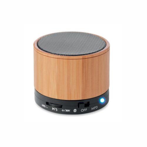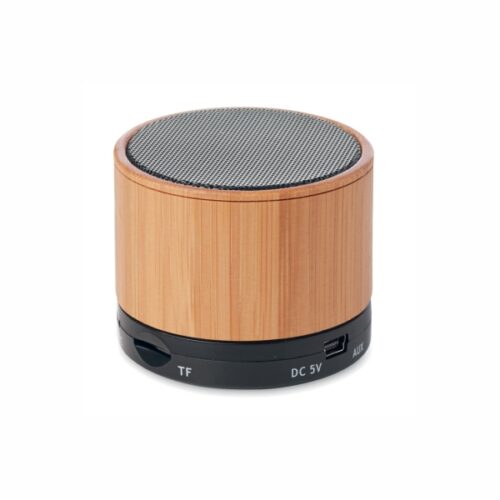 4.2 wireless speaker in ABS with bamboo casing and LED light indication. 1 Rechargeable Lithium 450 mAh battery included. Includes a SD card port and an AUX/ USB cable. Hands free call function. Output data: 3W, 3 Ohm and 5V. Playing time aprox. 3h. Bamboo is a natural product, there may be