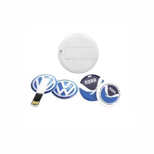 Promotional Plastic Slim like a credit card with a unique circular shape and high-speed data capabilities, this handy mini flash drive is a perfect to promote your business with. Design them from edge-to-edge with your logo, graphic image or your choice of text.