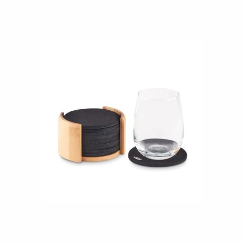 Set of 10 coasters made from RPET felt presented in a bamboo holder. These coasters made from recycled PET plastic will keep your table free of stains, but also help the environment as they are a sustainable choice. Bamboo is a natural product, there may be slight variations in colour and size per item, which can affect the final decoration outcome.