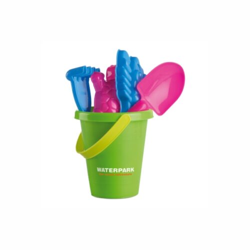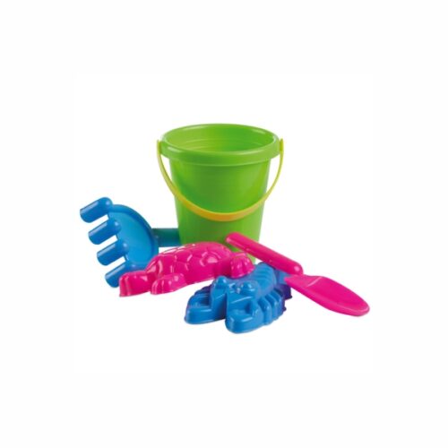 Children sand game composed of a bucket, a shovel, a rake and 2 moulds to make nice sand models. All made in shiny PP.