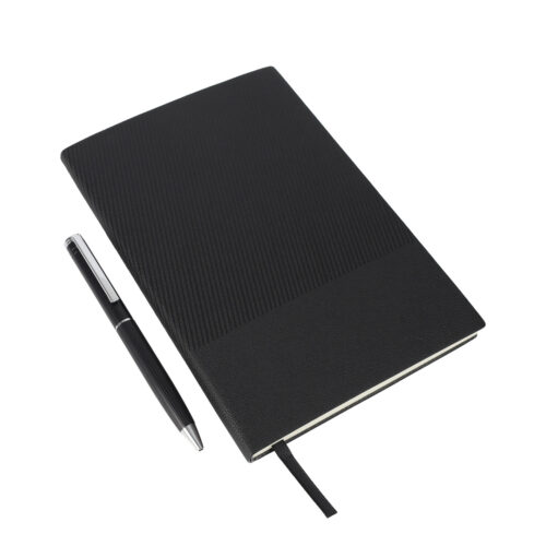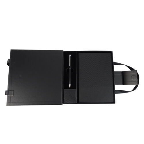 A large corporate gift box made from a kappa board with a 2.5 mm thickness, it features a magnetic closing and a handle. The gift box consists of a notebook that has 80 sheets of 100 GSM paper and a metal pen matching the colour of the box.