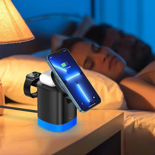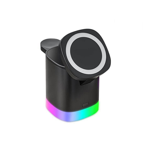 Siran is a 3-in-1 Compact Magnetic Wireless Charger that can simultaneously charge your wireless-compatible mobile phone, earpods and smartwatch (Apple only). Becomes flat for charging with Android and other wireless charging phones. Includes RGB ring lights. Packed in a gift box.