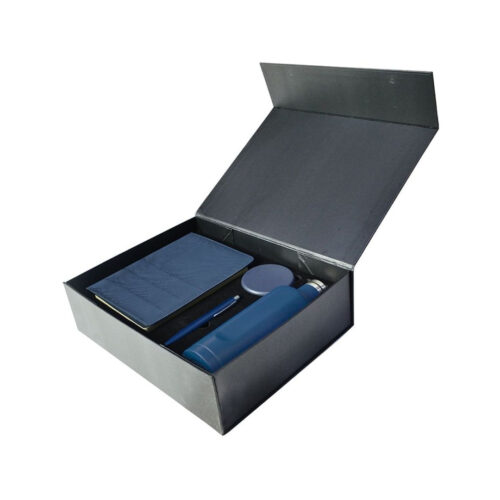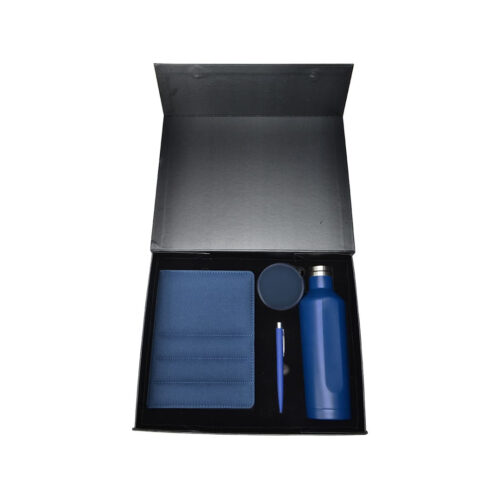 Gift Set containing A5 notebook, metal pen, recycled multicable set, double walled water bottle.