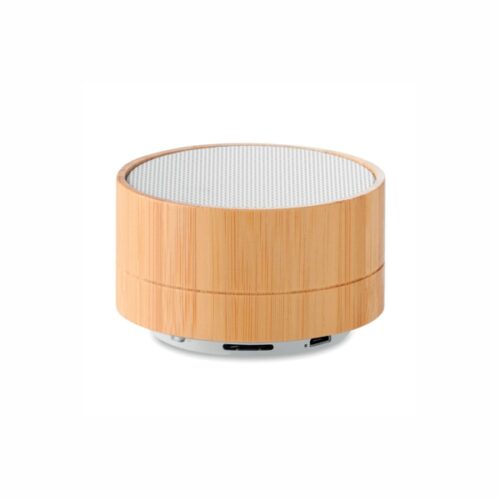 4.2 wireless speaker in ABS with bamboo casing. 1 rechargeable Li-on 450mAh battery and light at the bottom of the speaker. Output data: 3W, 4 Ohm and 5V. Micro USB cable included. Playing time aprox. 3h. Bamboo is a natural product, there may be slight variations in colour and size per item, which can affect the final decoration outcome.