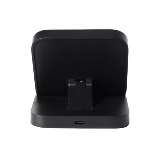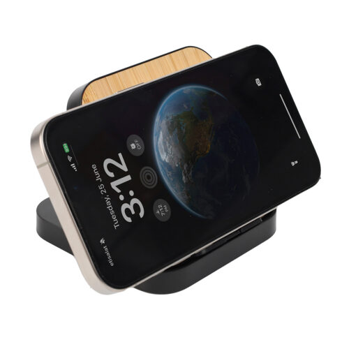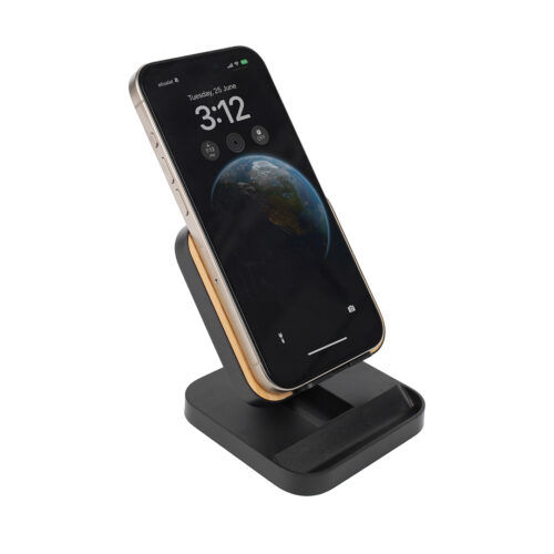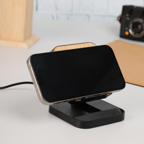 A mobile stand made from recycled ABS plastic and eco-friendly bamboo material with wireless charging properties. Comes with 15W fast charging feature works horizontally & vertically.