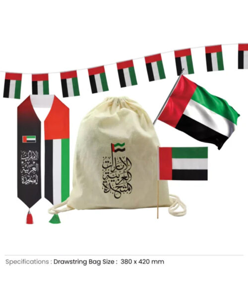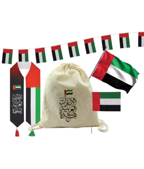 Celebrate UAE Day with our festive gift sets, thoughtfully packaged in a drawstring bag! Celebrate UAE Day with our vibrant gift sets, featuring 32 string flags, A4-sized UAE flags, a stylish scarf with Arabic writing, and a large satin flag. Packaged in a convenient drawstring bag, these sets are perfect for showcasing your national pride!