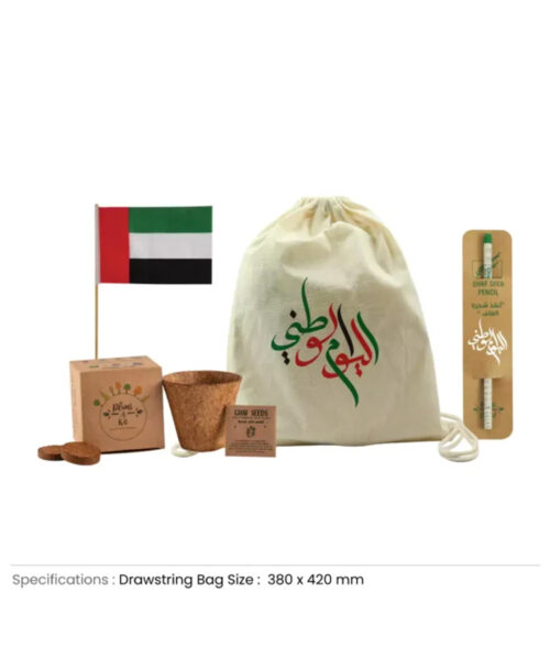 Celebrate UAE Day 2024 with our Drawstring Bag Gift Sets! This eco-friendly set includes a plantable pencil made from Ghaf seeds, A4-sized UAE flags for national pride, and a plantable kit with Ghaf seeds in a kraft box. A perfect blend of sustainability and celebration, ideal for sharing with friends and family!