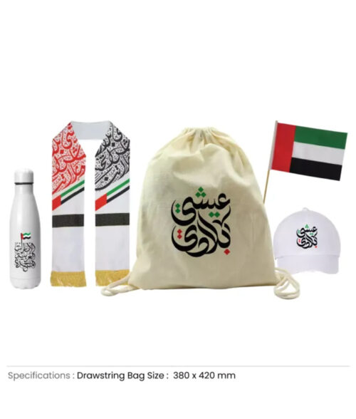 Celebrate UAE National Day with our festive gift sets, beautifully packaged in a drawstring bag! Celebrate UAE National Day with our vibrant gift sets, featuring a polyester scarf with gold tassels, A4-sized UAE flags, soft mesh caps, and durable stainless steel water bottles. Packaged in a convenient drawstring bag, these sets are perfect for showcasing your national pride!