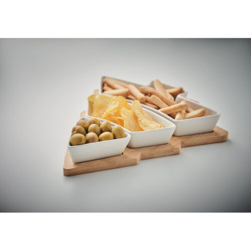 Tree-shaped bamboo serving platter with three ceramic serving dishes. Servesnacks, cheeses and other delicious food on this natural serving board. Presentthe platter and ceramic dishes as a whole or separate them to serve even morefood. Bamboo is a natural product, there may be slight variations in colour andsize per item, which can affect the final decoration outcome.
