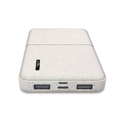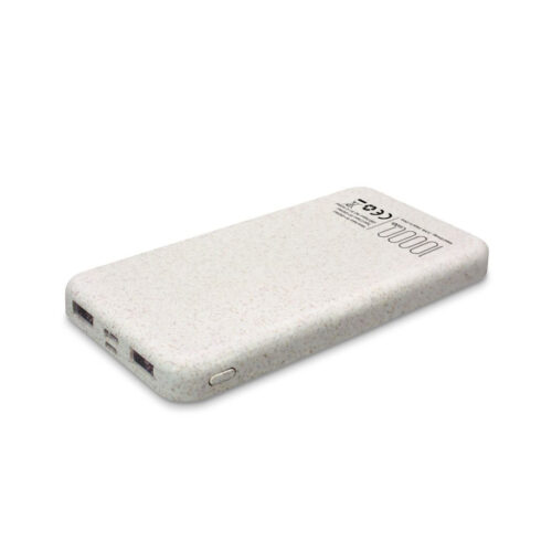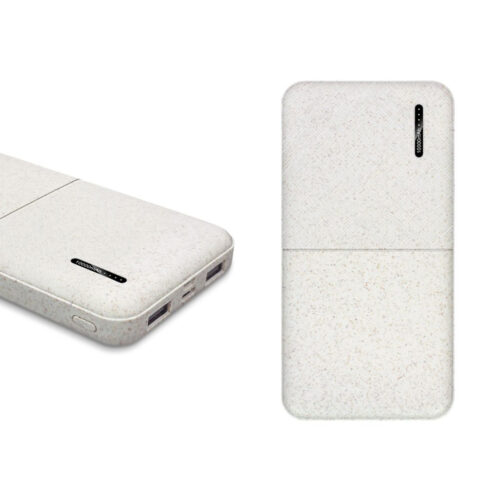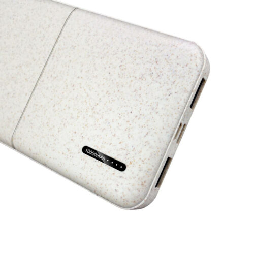 10,000mAh Li-Polymer wheat portable powerbank.  Product Size: 13.55×6.89×1.63cm. Packaging: Kraft Paper Box